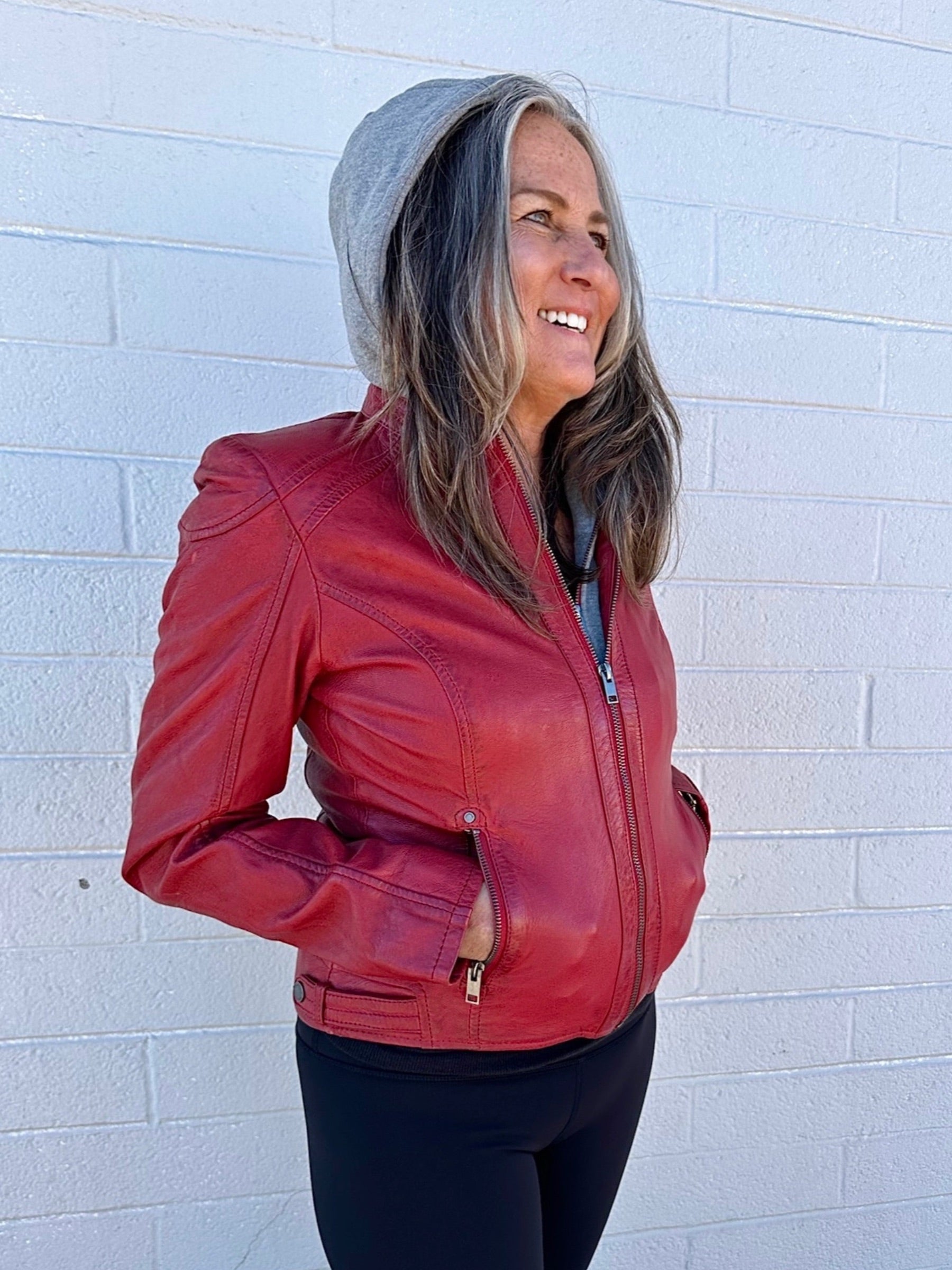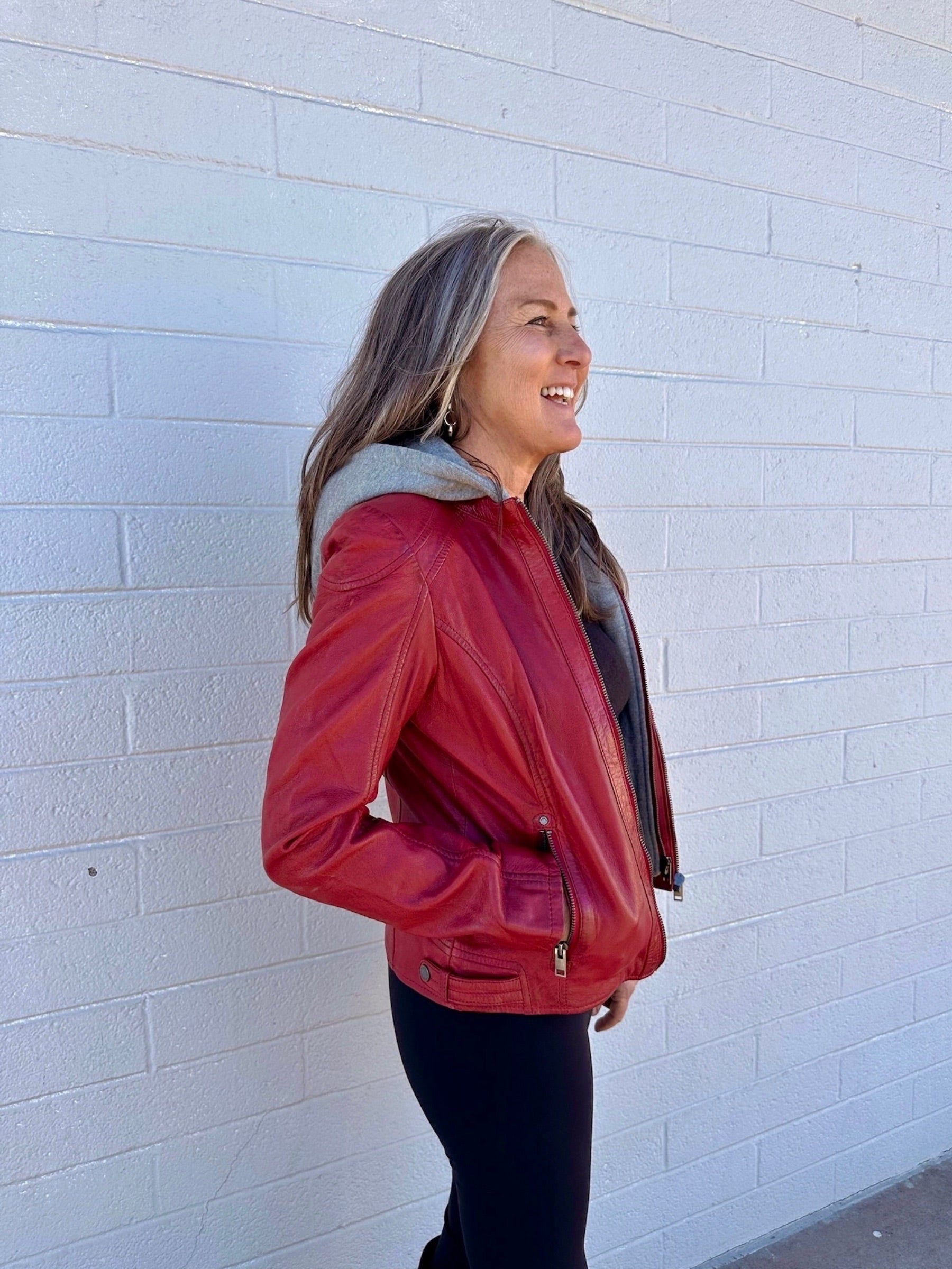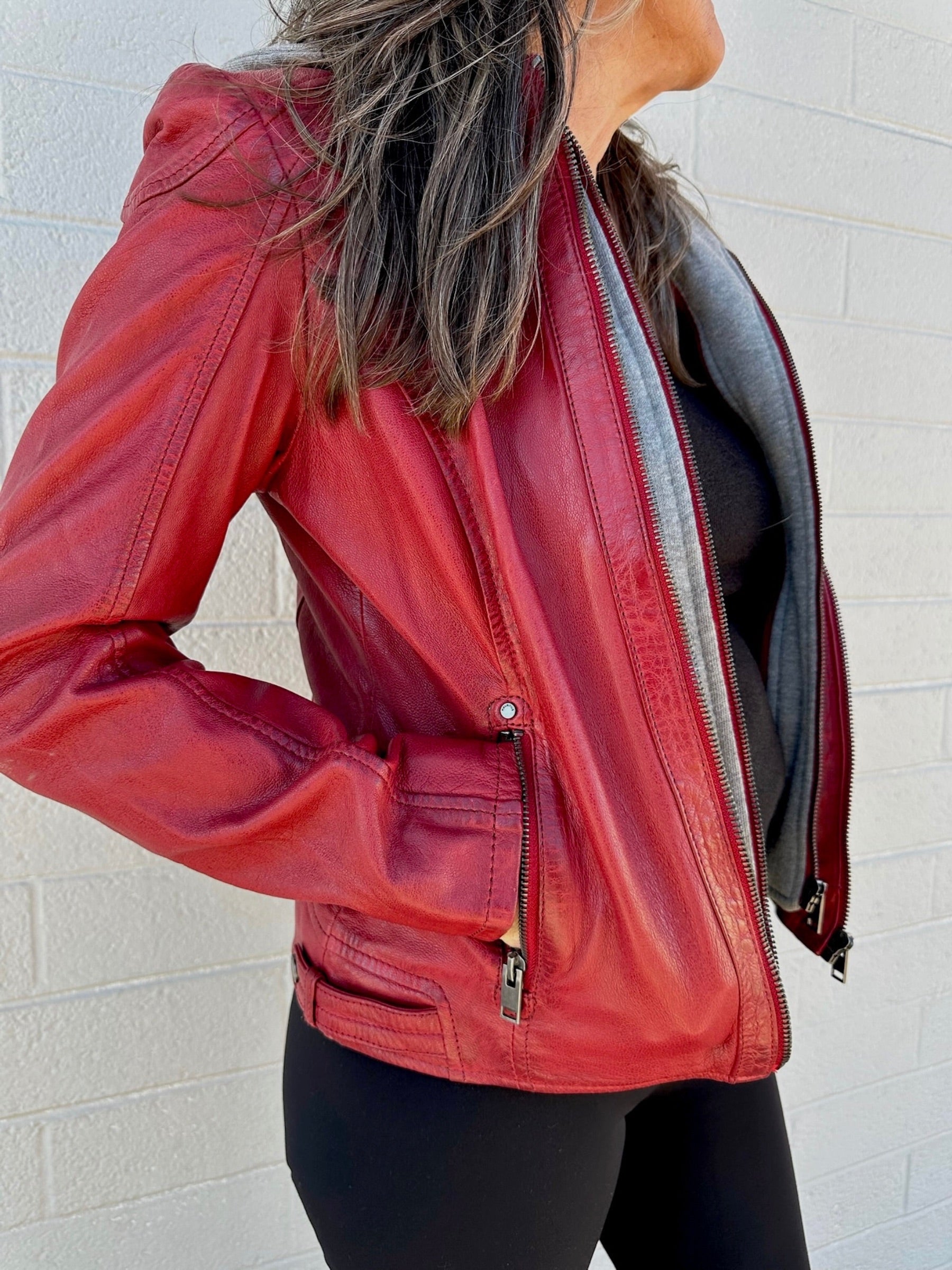 Discover the Allice Leather Jacket, crafted from lightweight 100% lambskin leather for midsize women seeking resort-ready coverage. The removable fleece hood transitions effortlessly from casual coffee runs to upscale dinners, while metal zippers on pockets and sleeves add subtle edge. Adjustable cuffs roll up or stay sleek, perfect for packing flat in carry-ons.