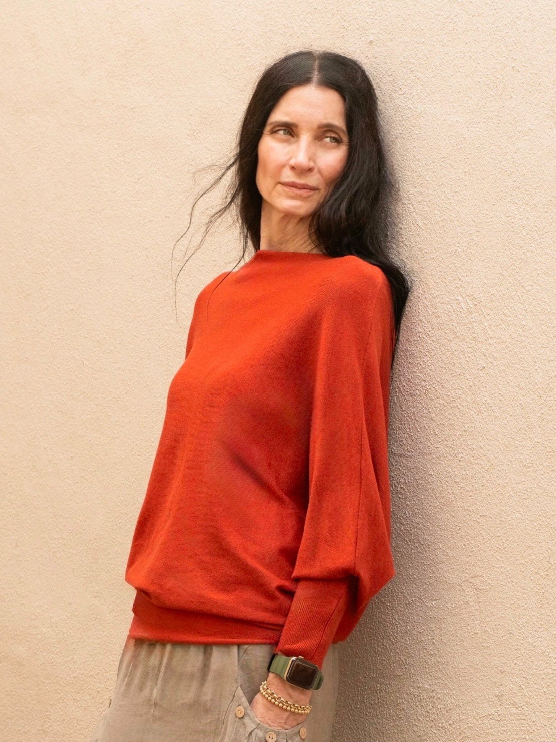 Defined by its modern silhouette and effortless elegance, the Kayla Knit Sweater is that rare find you’ll wear on repeat. Made from a soft, airy knit that feels luxurious yet breathable, it drapes beautifully through the upper body before tapering into a subtle shape at the waist and hips. The straight-across neckline highlights your collarbone with quiet confidence, while the relaxed sleeves gently narrow toward the wrist for a smooth, polished look. Lightweight enough for layering yet cozy enough for cooler days, it’s the perfect transitional sweater for women who value comfort, style, and pieces that move with them through every season.