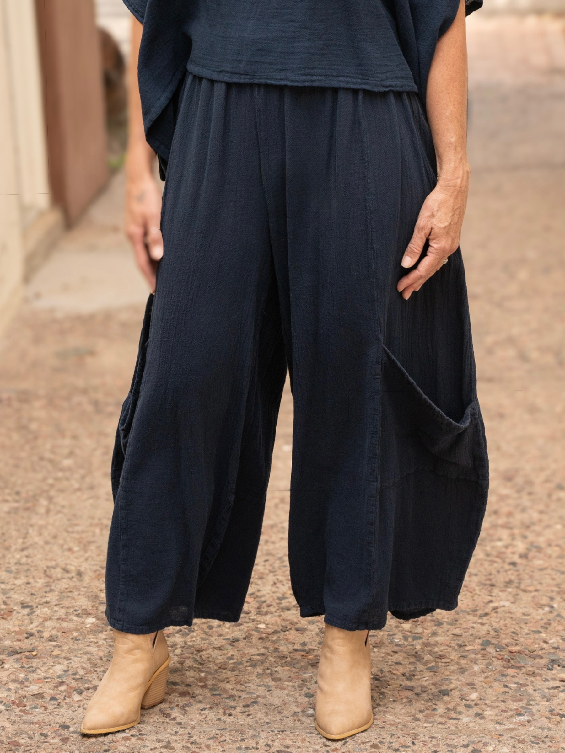 The Lucy Pant is the wide leg—relaxed, modern, and made to move with you. With bold oversized pockets, a comfy elastic waist, and a flowy shape that flatters without fuss, it’s part palazzo, part utility, all ease. Stylish, breathable, and anything but boring.