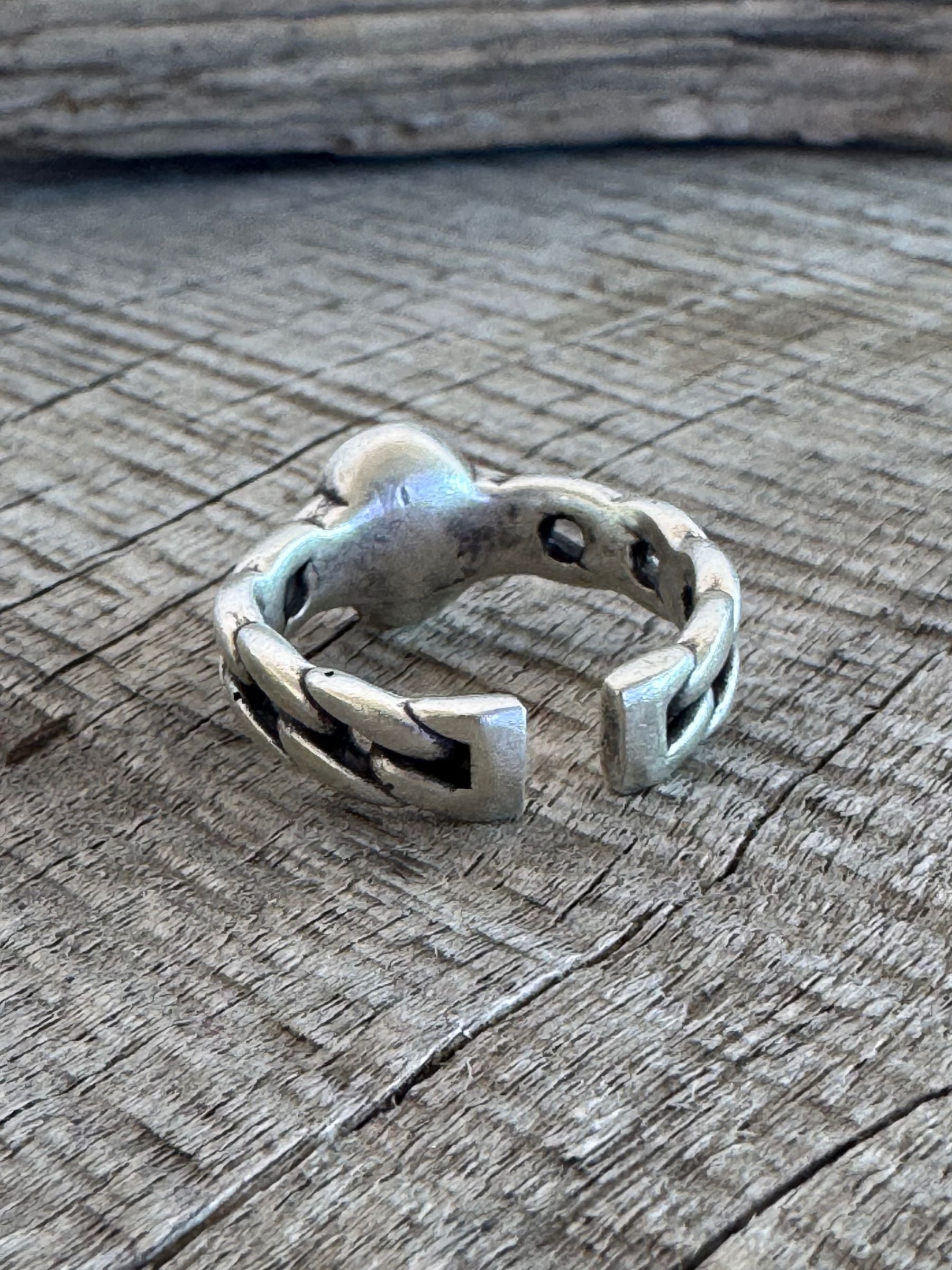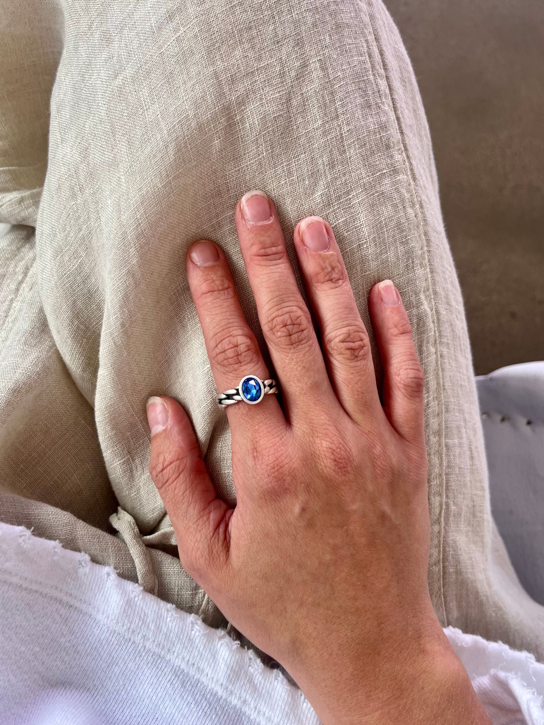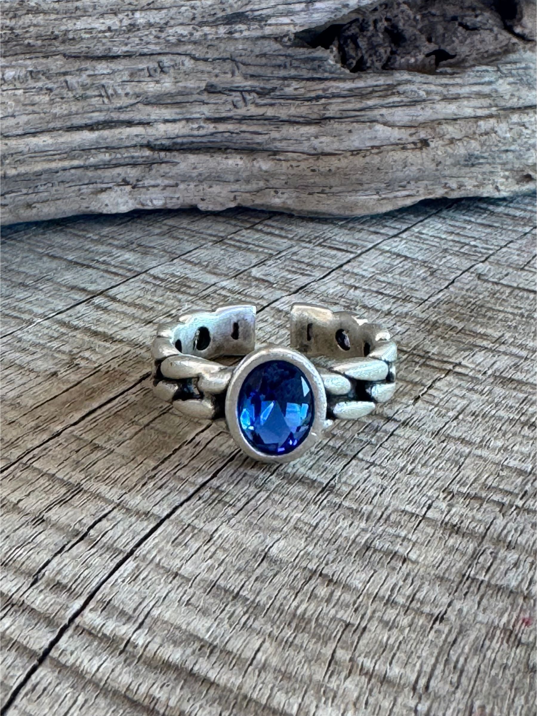 Deep blue meets handcrafted silver, and the result is a ring that stops people mid-sentence. Rita features a single sapphire crystal set in a textured chain-link band that brings a rich pop of color to everything you wear. If you've ever been told that blue brings out your eyes, this is why. Rita draws attention exactly where you want it: up toward your face and your confident, unbothered energy. Pair her with neutrals and watch her steal the entire outfit.