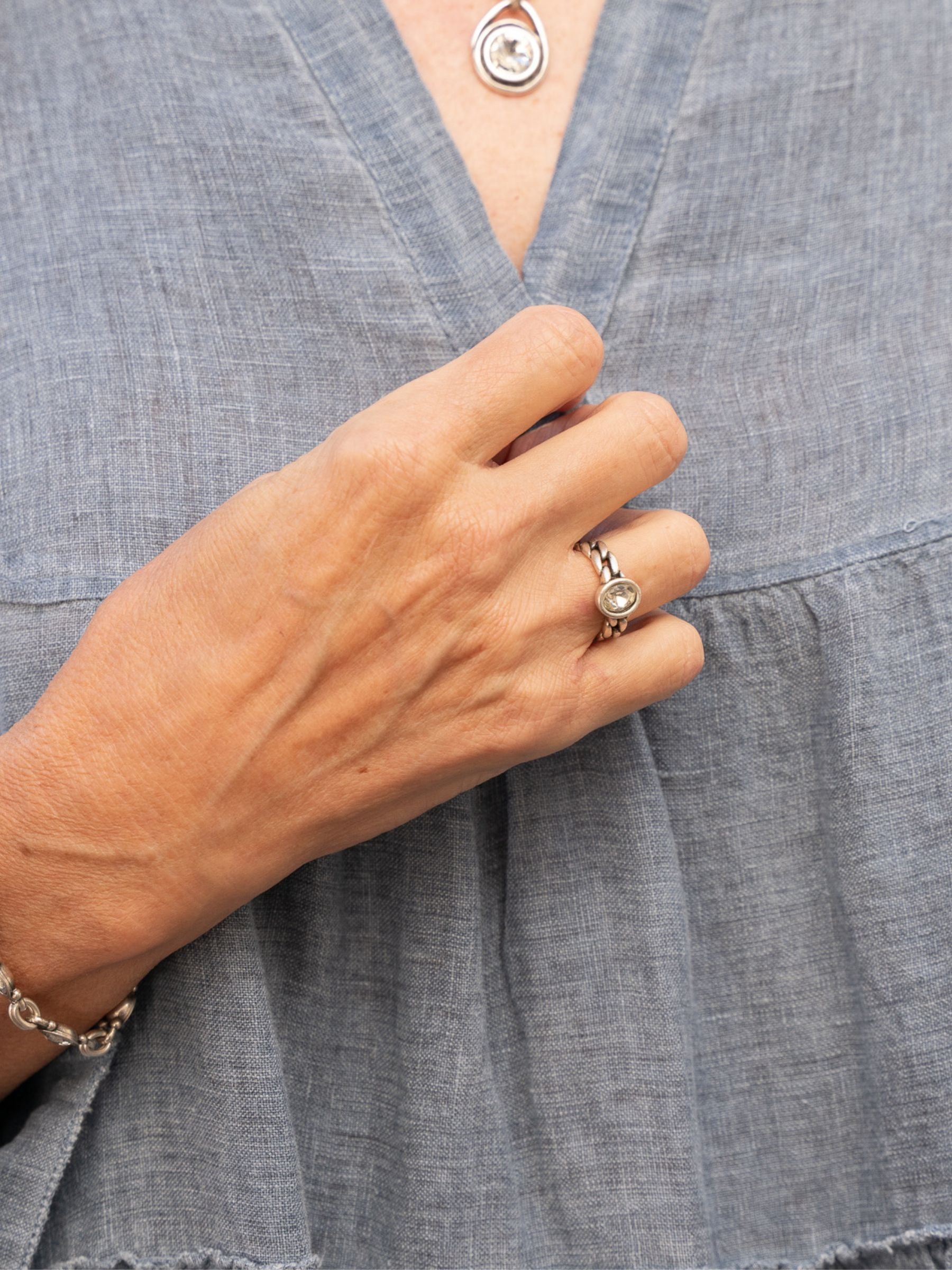 Named Ruth because she's reliable, shows up beautifully, and never lets you down. A single clear crystal set in handcrafted 925 silver plating with a chain-link band that adds texture and personality without trying too hard. Stack it with your other favorites or wear solo on days when simplicity wins. She goes with your morning coffee outfit just as well as your dinner plans.